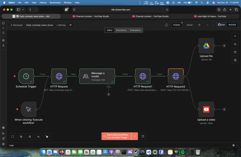 Automated YouTube channel that creates and uploads comedy news videos 3x/week using AI. Complete n8n workflow + custom video service. Setup in 1-2 hours.